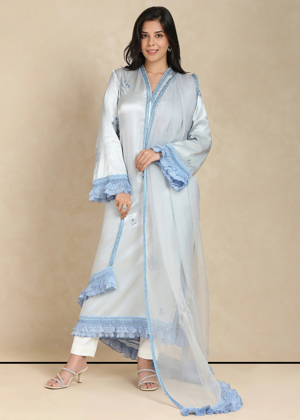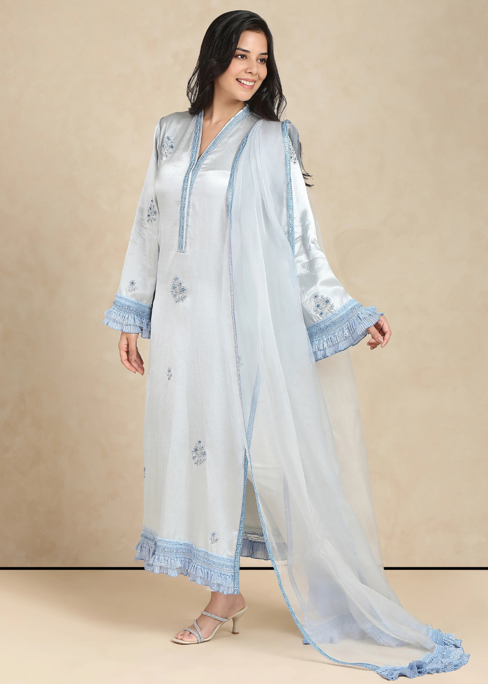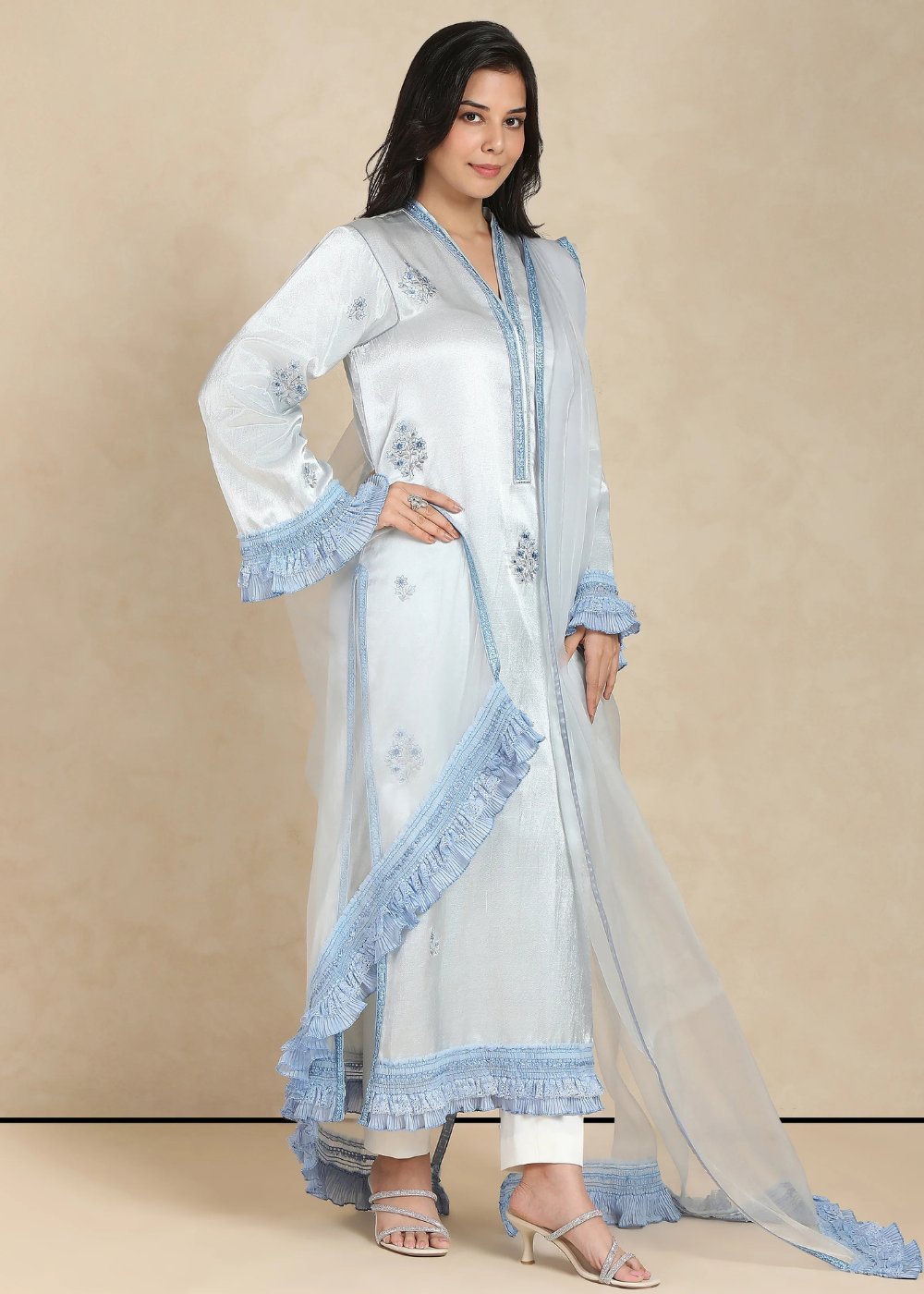 Step into elegance with the Iris Kurta Set, where timeless design meets unparalleled craftsmanship. The soft, flowing fabric in delicate hues complements the intricate hand-embroidery of resplendent florals, creating a serene yet striking silhouette. The kurta features a gentle, fluid drape that gracefully skims the body, paired with trousers that offer both comfort and style. A sheer organza dupatta, adorned with subtle details, completes the look with an air of refined sophistication. Iris is an ode to femininity—perfect for those who appreciate beauty in its most understated form. Elevate your wardrobe with this exquisite ensemble, crafted to transcend seasons and trends.